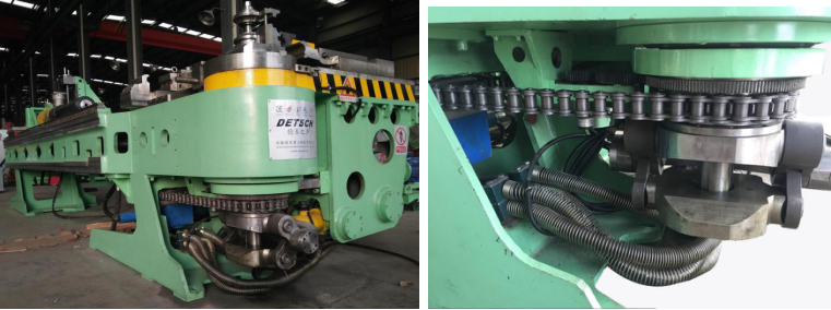 4、采用兩個中鉸耳軸浮動油缸和雙排短節距滾子鏈構成彎管傳動系,傳動平穩,無脈動,無啃軸現象,并具有左彎和右彎模塊功能,可承受大弧推彎和小半徑頂鐓的反向作用力