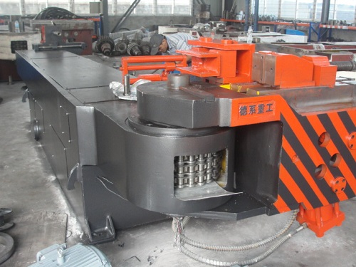主傳動:由床身、鏈條、主軸等組成,床身為鋼板焊接結構, 彎管時主油缸起作用經鏈條帶動主軸旋轉已達到彎管目的。