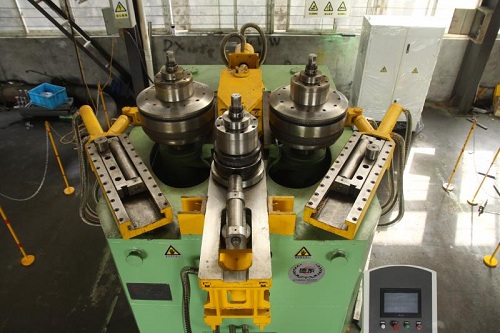 07.回轉電動和液壓位移驅動:一次上料完成,各種型材(角鋼、槽鋼、H型鋼、圓鋼等)端部預彎和回轉彎曲成型,可將各種型材彎曲成所需要的圓形、弧形、螺旋形、橢圓形等預定曲率工件。